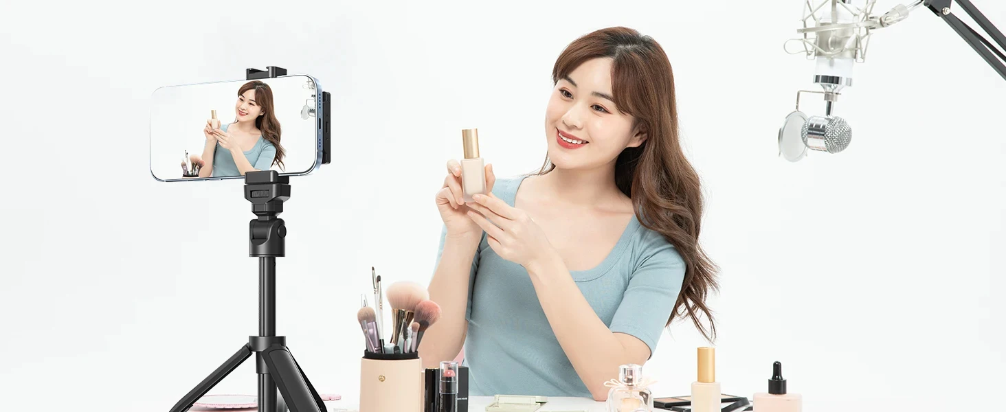 Our product includes a Bluetooth remote control.which can seamlessly connect to your smartphone, providing a reliable and stable connection. No more worrying about losing signal or experiencing delays. Works with all major smartphone brands, giving you the freedom to capture the perfect shot from a distance. No more awkward arm extensions or rushed selfies!