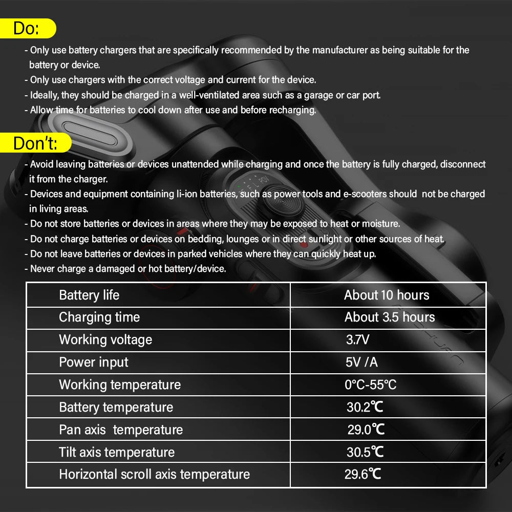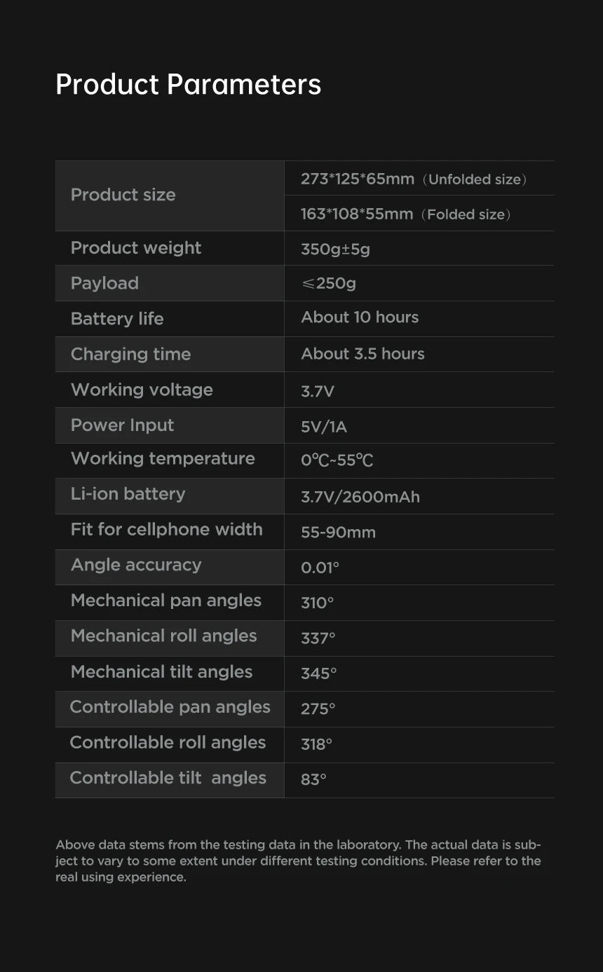 Equipped with 2600mAh high-density lithium cell, 3 hours charging meets 10 hours operation. Get rid of battery endurance anxiety from this moment. Film at ease and enjoy photography freely.